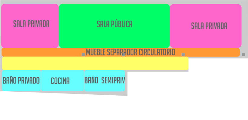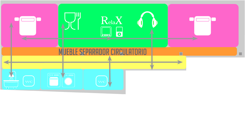 Las características de la vivienda con vigas por toda la superficie, el escaso espacio contribuyeron a crear un mueble que cruza por toda la casa y a su vez distribuye y comunica todos los espacios. Se convierte en tu compañero de piso.