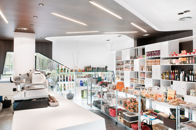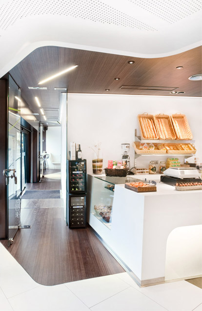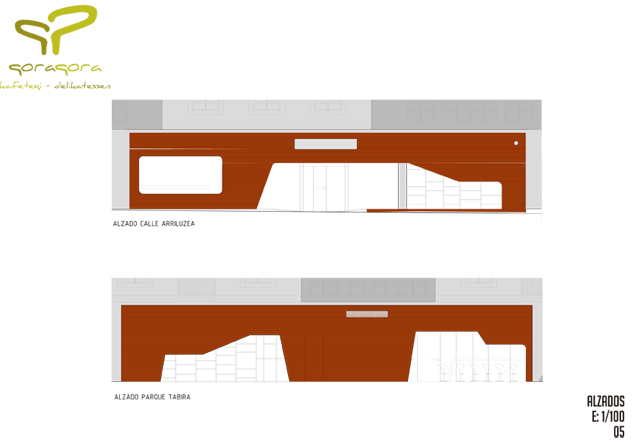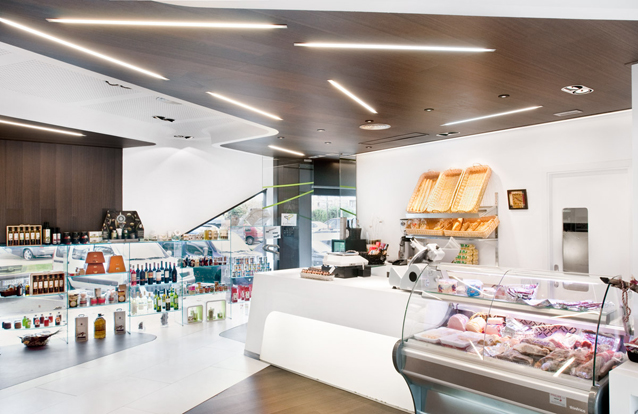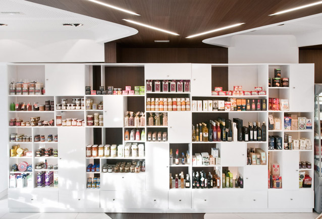 In the area of exhibition and sale of food-catering products is located a bar-attending desk for customers service, which also arises from the private core, while in the front another furniture piece is designed to display and storage of foodstuff.