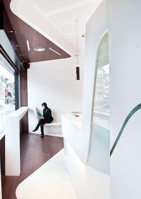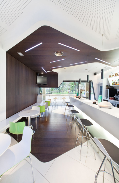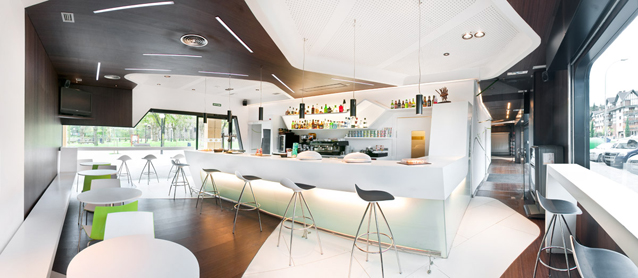 Bank along the back of the bar. Support for the main bar – attending desk to accommodate the user and invite new perspectives throughout the whole space with hidden support-structure system for achieving a feeling of lightness-floating and continuity in space.