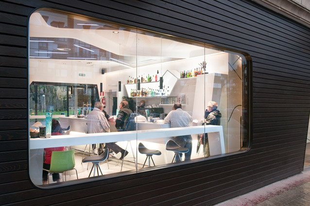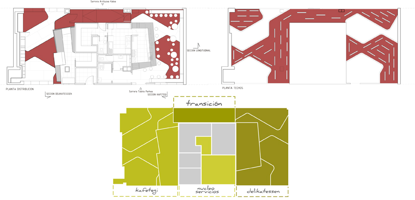 By having the food-catering shop we separete the bar-space from another one, in the same street, with the same use to 25m which is a local rules parameter. This condition helps to the zoning of activities, placing the food sales area within that distance and after it we start with the private core services area which contains, warehouse, kitchen and toilet / dressing area private and public toilets all of them to serve the workers. When this volume finish begins with the bar-space activity with an adjacent bar-attending desk to this core that guides the visitors all over the space as it cross the entire space with differente shapes for its convenient location, function, wheelchair acces, permeability and attractive. All of this, together with the openings of big specific holes in the facades get a united and opened space with 360º views around the local.
