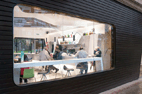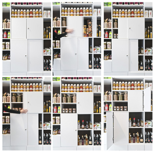furniture stand for food-catering shop. System of opening and closing, sliding hidden doors, making versatility and flexibility in use for display and storage. Reinterpretation of the system at owners criteria and / or product based on each season.