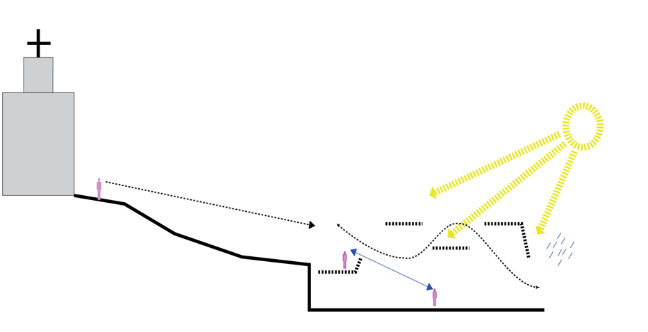 Se entiende el proyecto como la integración de un nuevo elemento arquitectónico paisajístico dentro del entorno de la Ikastola de Mendaro, la iglesia Trinidad y el entorno urbano que lo rodea.