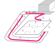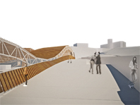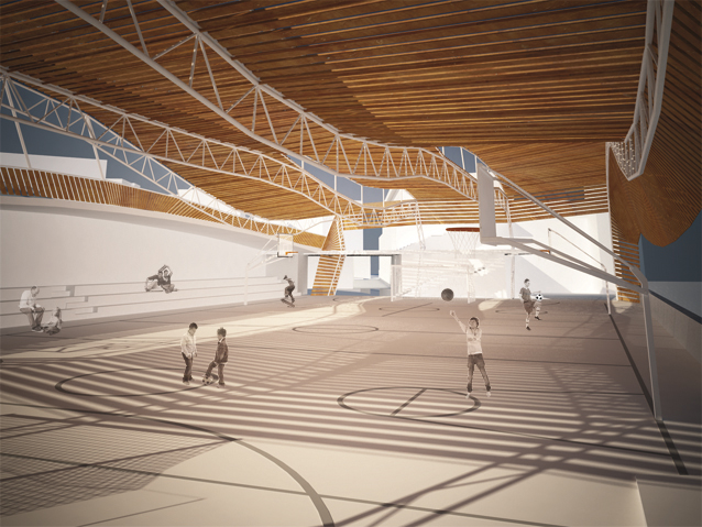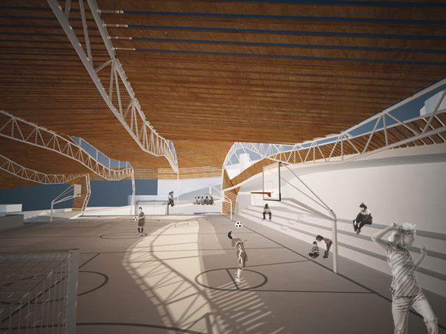 Otro aspecto fundamental que recoge el proyecto es la unión de la ikastola con este elemento de cubrición, creando un lugar-balcón hacia el patio de juegos, y una conexión de la ikastola con el patio ya que este balcón a través de la formación de una rampa comunica ambos espacios en diferentes alturas, creando un juego de recorridos, de espacios, de visión y perspectiva, que se une a la idea paisajística del resto del proyecto.
