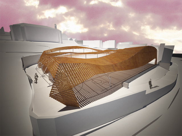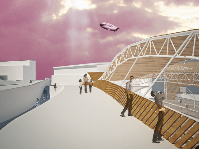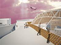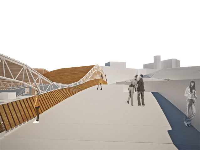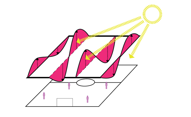 Se cubre el espacio con una cubierta dividida en 3 crujías diferentes, cada una con una sección independiente, de manera que comparten la estructura que las soporta, pero creando una sensación de plasticidad y movimiento que recuerda la sensación de un surfista dentro de una ola.