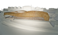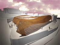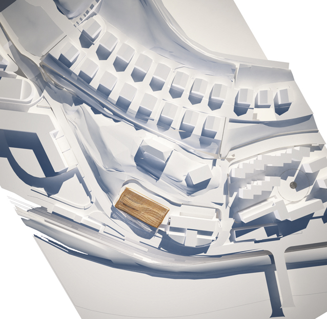 Esta cubierta ondulante, vista desde la ermita, dialoga perfectamente con el entorno como si una sábana se posara sobre la propia topografía que va cayendo hacia el río.