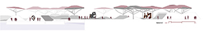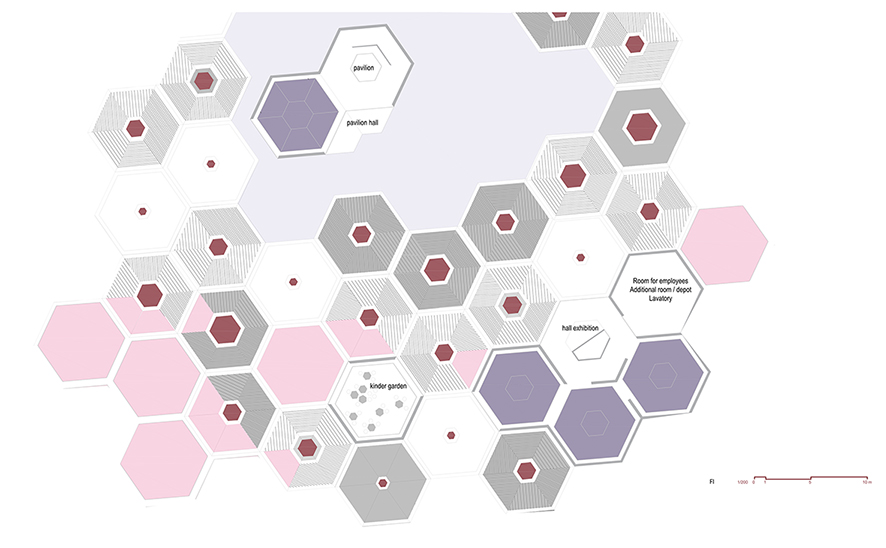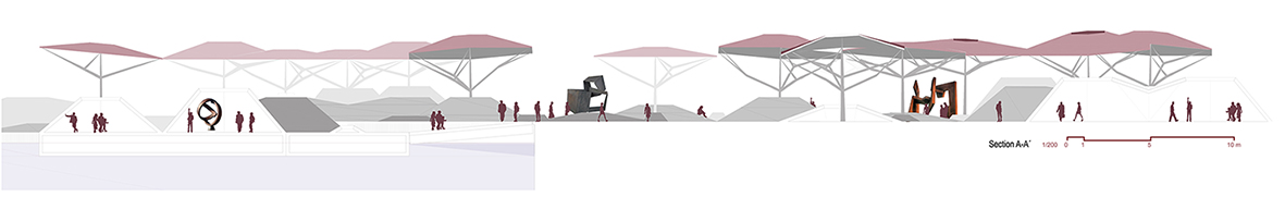 The permanent exhibition area, the kinder-garden and workshops pavilions will be closer to urban activity, creating a new dynamic façade following the street straight line while the flat patterns leaves the space to enter the park, one in front of the concert hall of the city and the other one at the east corner connecting the street into the park. Once you enter, a world of perspectives and landscapes is opened to your eyes, while the outdoor art is exhibited in this unique space.