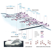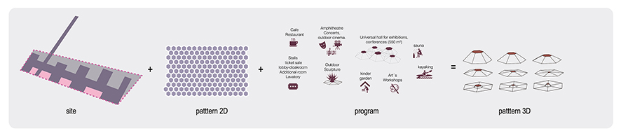The way to occupy and spreading through this space will be done by a cellular pattern that extents all around the whole space. Adapting to each new situation induced by the program, circulations, topography, we can complete with the pattern and its variations all the functions of the new Art-Park.