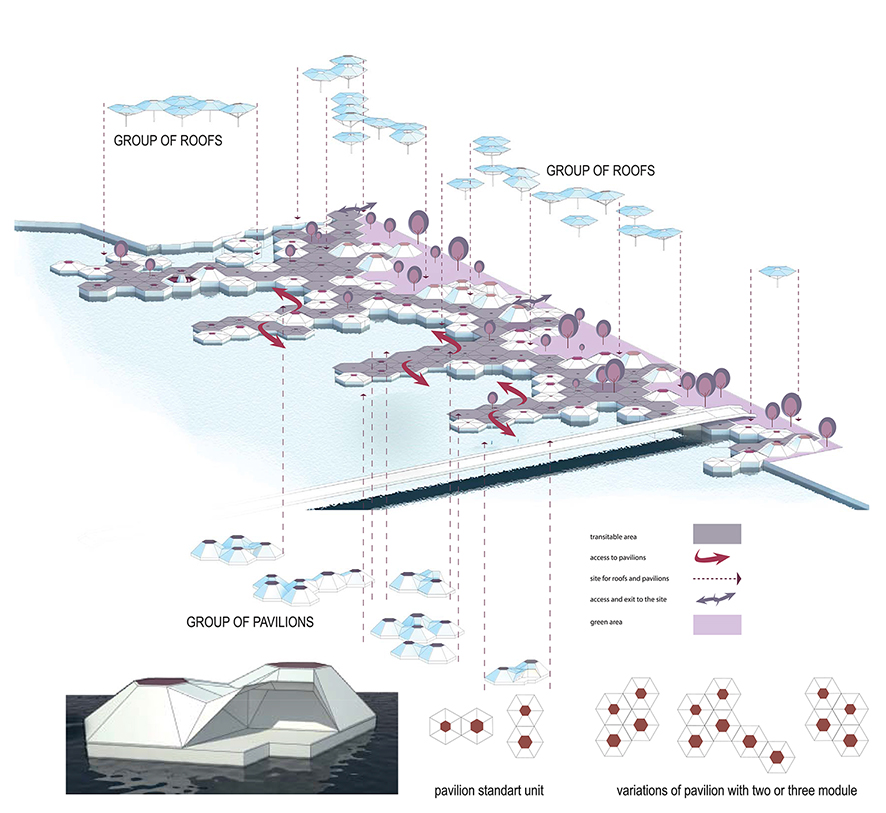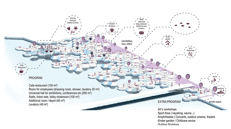 As every waterfront used to get to a boat, we need a pier, so with this new piers our park extents in order to get an access to the floating pavilions. Three piers for pavilions access, and two extra ones, the leisure, chill out, outdoor theatre pier placed at the east side, and a sports pier, with sauna and kayak renting shop to he west side.