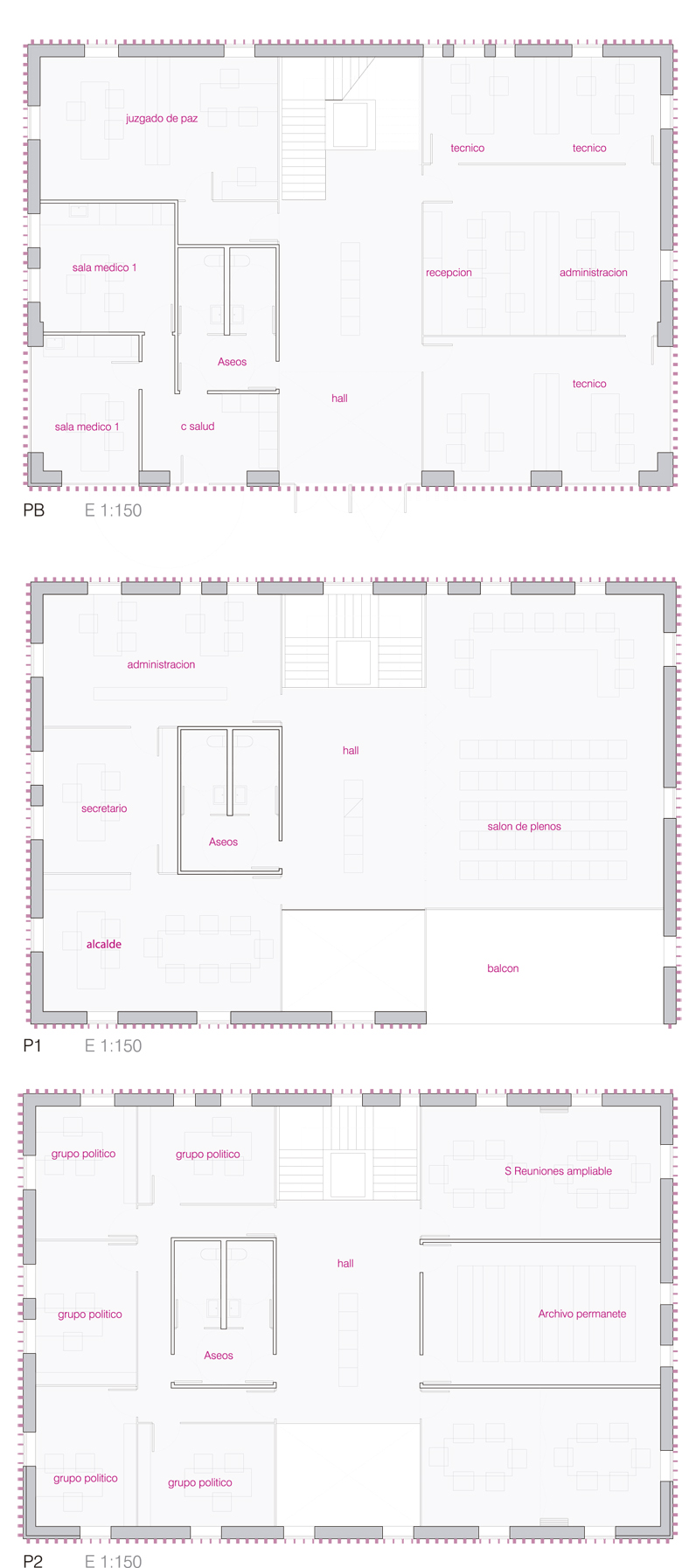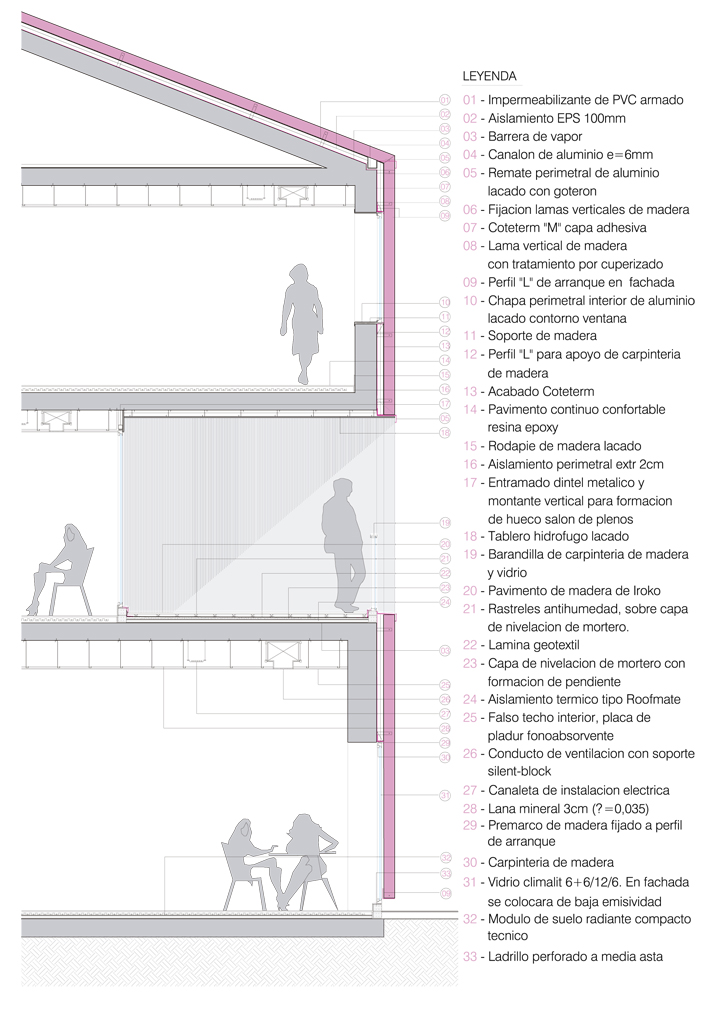 No hay que olvidar que la imagen del edificio está arraigada en la memoria colectiva. No se pretende borrarla sino difuminarla desde el respeto. Para ello se rodea de un velo formado por un cerramiento continuo de lamas verticales de madera que permitan intuir la disposición original de ventanas y arcos. El material aportará la contextualización rural y la continuidad unidad, privacidad y escala. Esta continuidad se verá interrumpida únicamente por una apertura al salón de plenos que pretende la aproximación al ciudadano del acto representativo por antonomasia: el pleno.